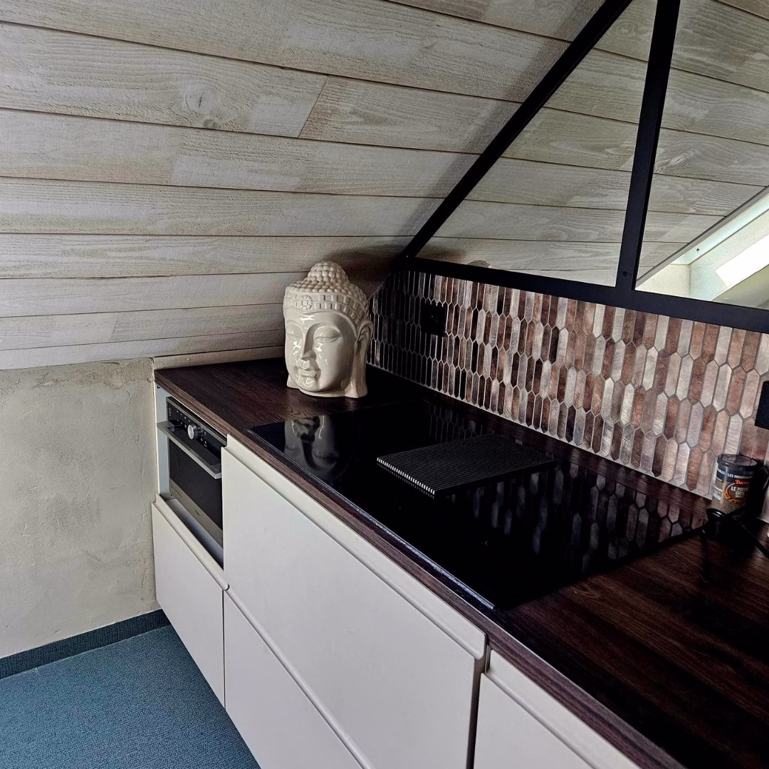 Un fauteuil massant enveloppant, un sofa tantra de relaxation; une grande cuisine équipée et des espaces harmonieux bercés de miroirs font de la suite Ananda Duplex un hébergement tout confort parfait pour un weekend romantique, une escapade amoureuse dans cette Love room à Carnac