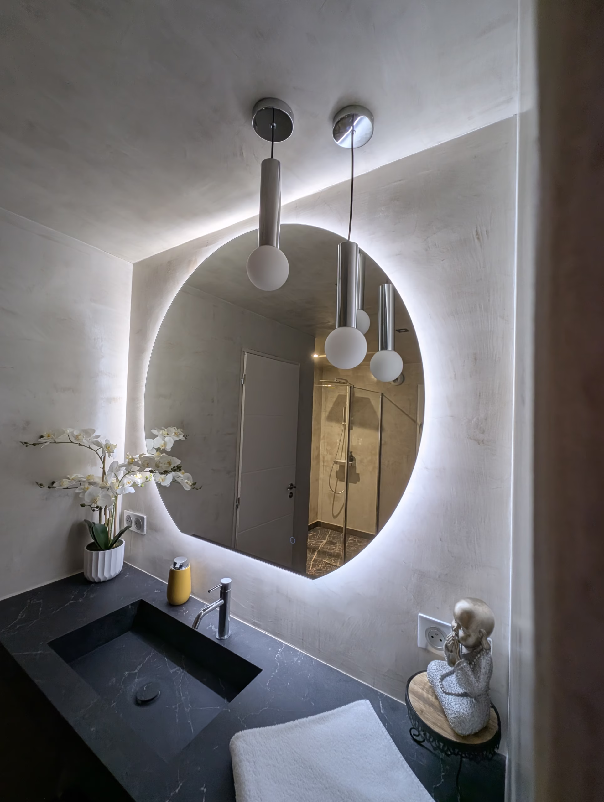 Entrez dans un univers raffiné et apaisant où le béton ciré, le métal oxydé et les tons chauds se mêlent à la douceur des lumières tamisées.